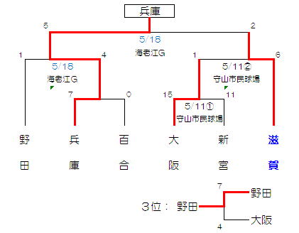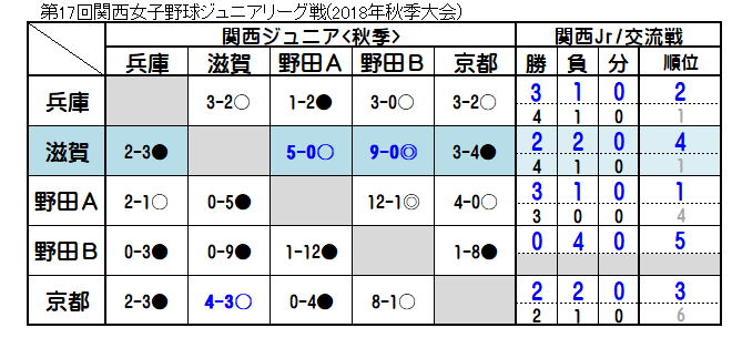 | オール兵庫Jr | 9-4○ | 2-3● | 10-0○ | 7-0○ | 16-4○ | 4 | 1 | 2 | |
