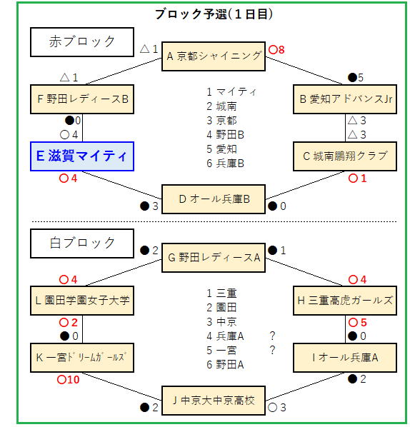 | Aリーグ | 野田 | 兵庫 | 大阪 | 滋賀 | 勝 | 負 | 順位 |