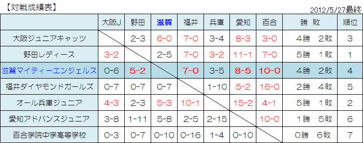 | 兵庫 | 野田 | 滋賀 | 愛知 | 新宮 | 福井 | 勝 | 負 | 順位 | |